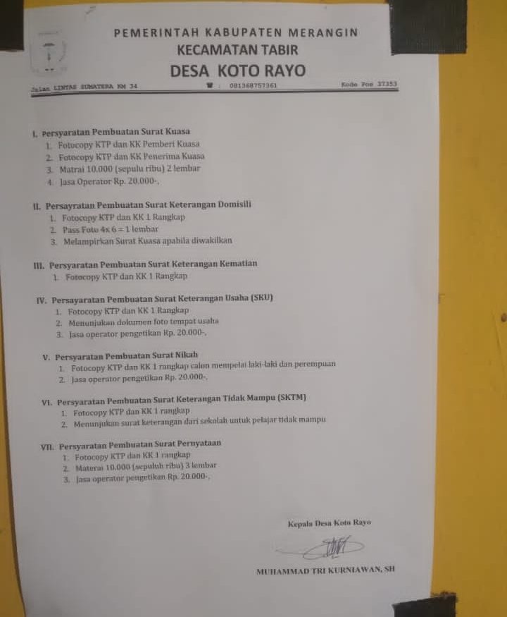 JurnalOne.com, BANGKO – Masyarakat Desa Koto Rayo, Kecamatan Tabir Induk, Merangin, Jambi dibuat meradang oleh Kepala Desa Try Kurniawan, lantaran mematok Rp 20 ribu setiap mengurus surat menyurat di Kantor Desa, Senen (11/092023).