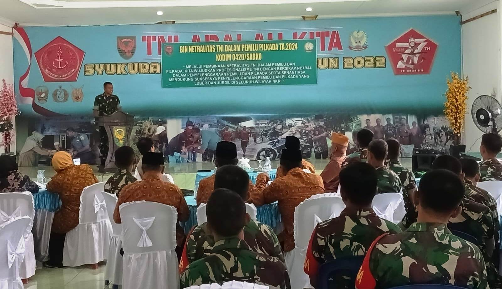 JurnalOne.com, BANGKO – Komandan Kodim 0420/Sarko, Letkol Inf Suyono, menegaskan ke anggota dan Veteran Purn agar menjaga netralitas TNI pada pelaksanaan pemilu 2024, Selasa, (06/02/2024).