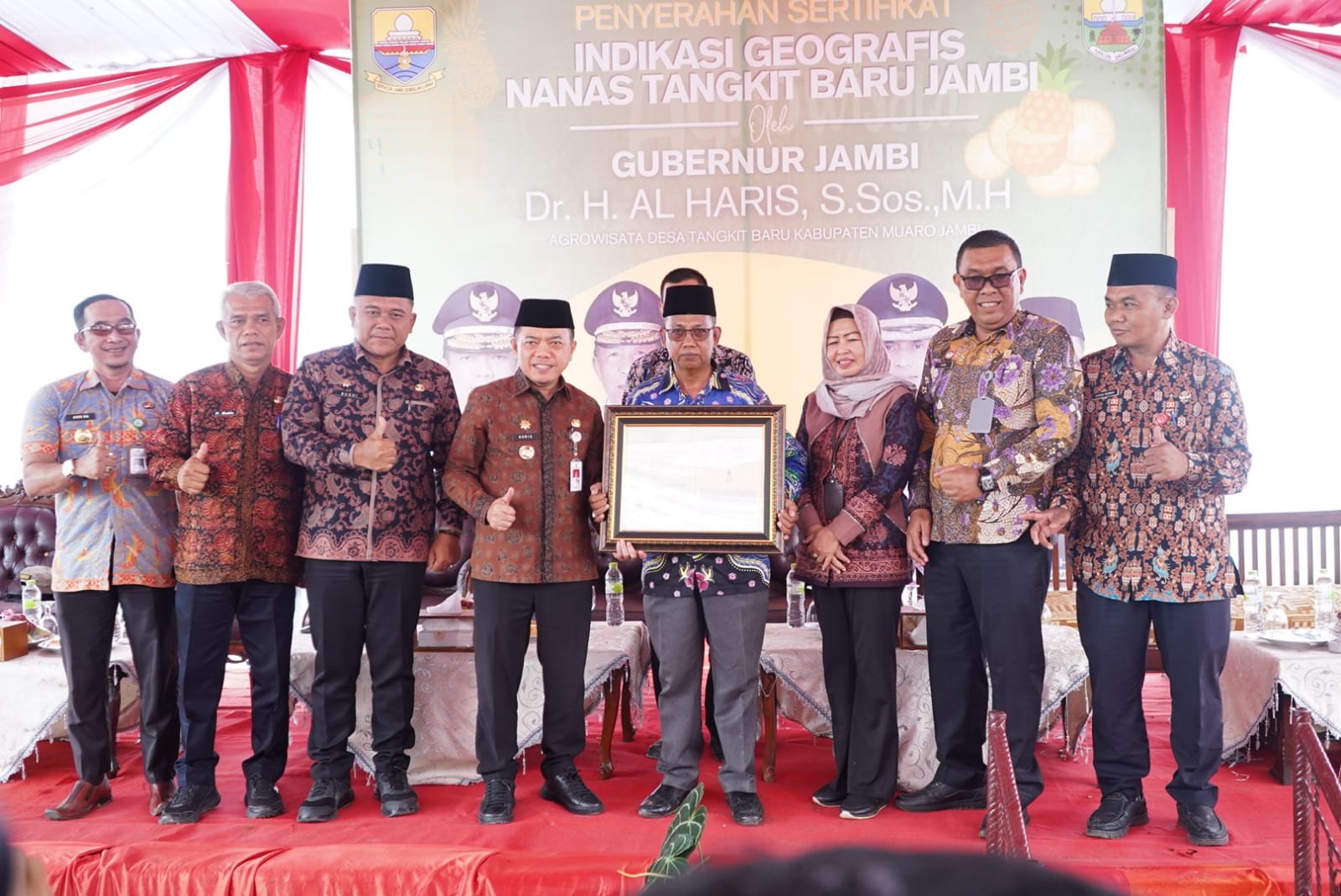 JurnalOne.com, MUARO JAMBI – Gubernur Jambi, Al Haris menyerahkan Sertifikat Indikasi Geografis bagi Komoditas Nanas terletak di Agrowisata Desa Tangkit Baru, Kecamatan Sungai Gelam, Kabupaten Muaro Jambi, Kamis (16/05/2024) lusa.