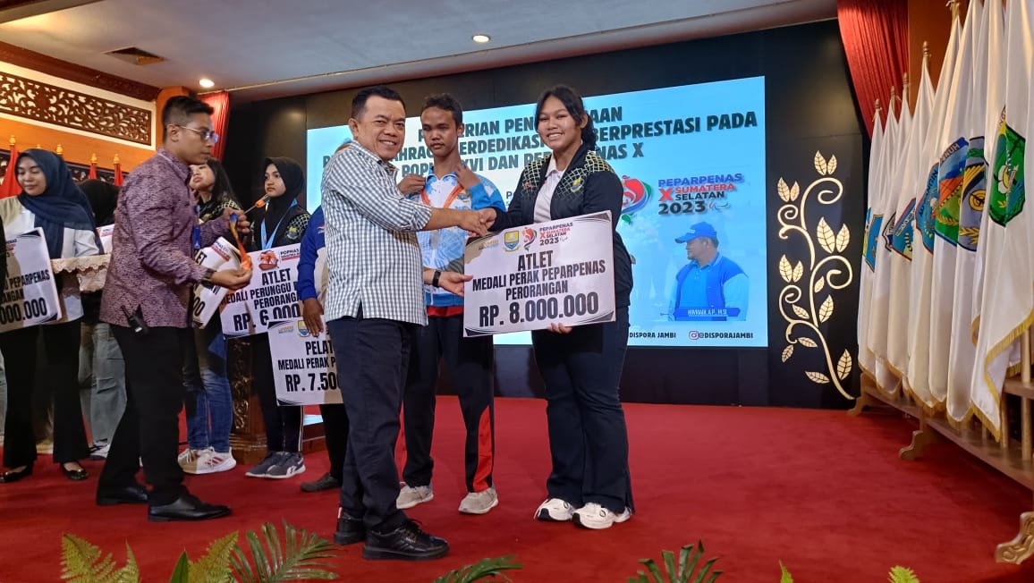 Penghargaan dan bonus ini diberikan kepada atlet dan pelatih yang berhasil mempersembahkan medali.Provinsi Jambi berhasil mempersembahkan 3 emas,13 perak dan 9 perunggu.Sementara di Peparpenas X kontingen Provinsi Jambi berhasil meraih 3 perak dan 2 perunggu.