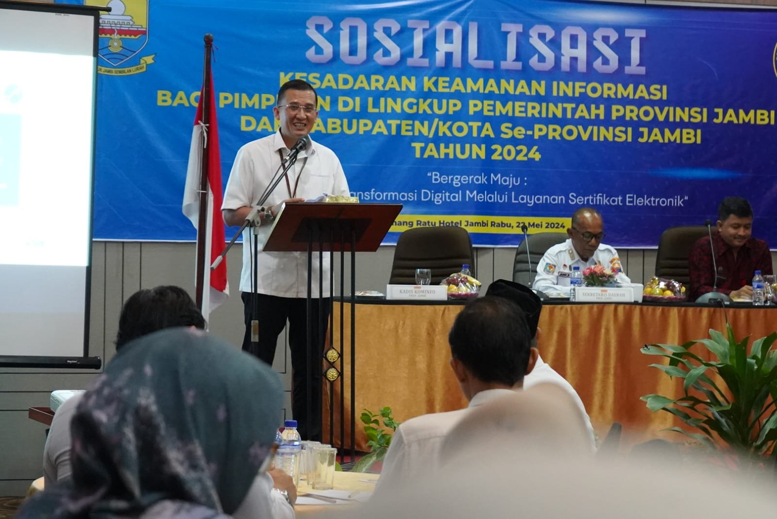 Sekda Provinsi Jambi dalam sambutan tertulisnya yang dibacakan oleh Asisten III Setda Provinsi Jambi Jangcik Mohza menyatakan bahwa kegiatan sosialisasi kesadaran keamanan informasi bagi pimpinan ini merupakan bagian dari upaya bersama untuk meningkatkan pemahaman dan kesadaran akan pentingnya keamanan informasi di lingkup kerja.