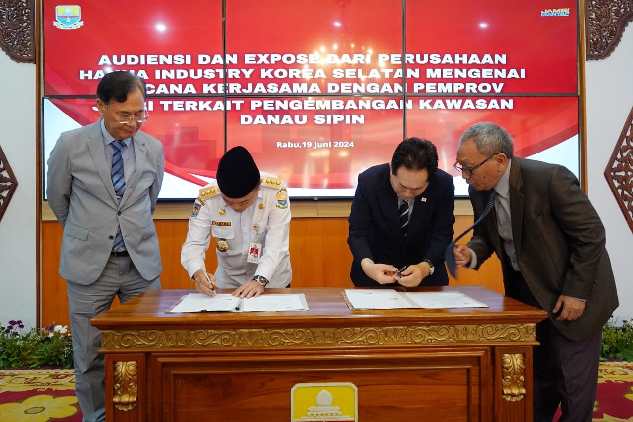 JurnalOne.com, JAMBI – Gubernur Jambi, Al Haris menandatangani Memorandum of Understanding (MoU) dan Audensi, sekaligus Ekpose dengan pihak Perusahaan HANHA Industry Korea Selatan, terkait rencana pengembangan Danau Sipin, Kota Jambi, Rabu (19/06/2024) pagi kemaren.