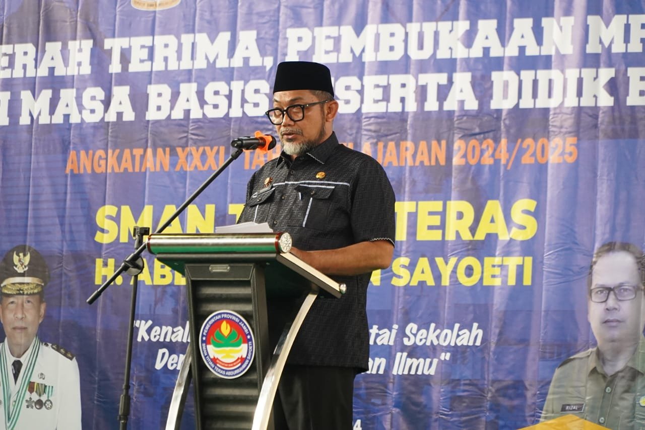 JurnalOn.com, JAMBI – Sekretaris Daerah (Sekda) Provinsi Jambi Sudirman, Sekda saat membukaan Masa Pengenalan Lingkungan Sekolah (MPLS) dan Masa Basis Peserta Didik Baru Angkatan XXXI Tahun Pelajaran 2024/2025, di GOR SMAN Titian Teras, Abdurrahman Sayoeti, Rabu (10/07/2024) petang.