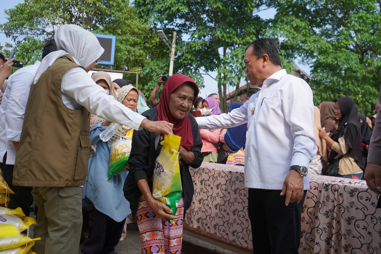 Dikesempatan itu, Mendag bersama Gubernur Al Haris, Pj. Walikota, unsur Forkompimda dan sejumlah OPD membagikan beras SPHP kemasan 5 Kg secara gratis sebanyak 500 karung kepada warga masyarakat sekitar Talang Banjar.