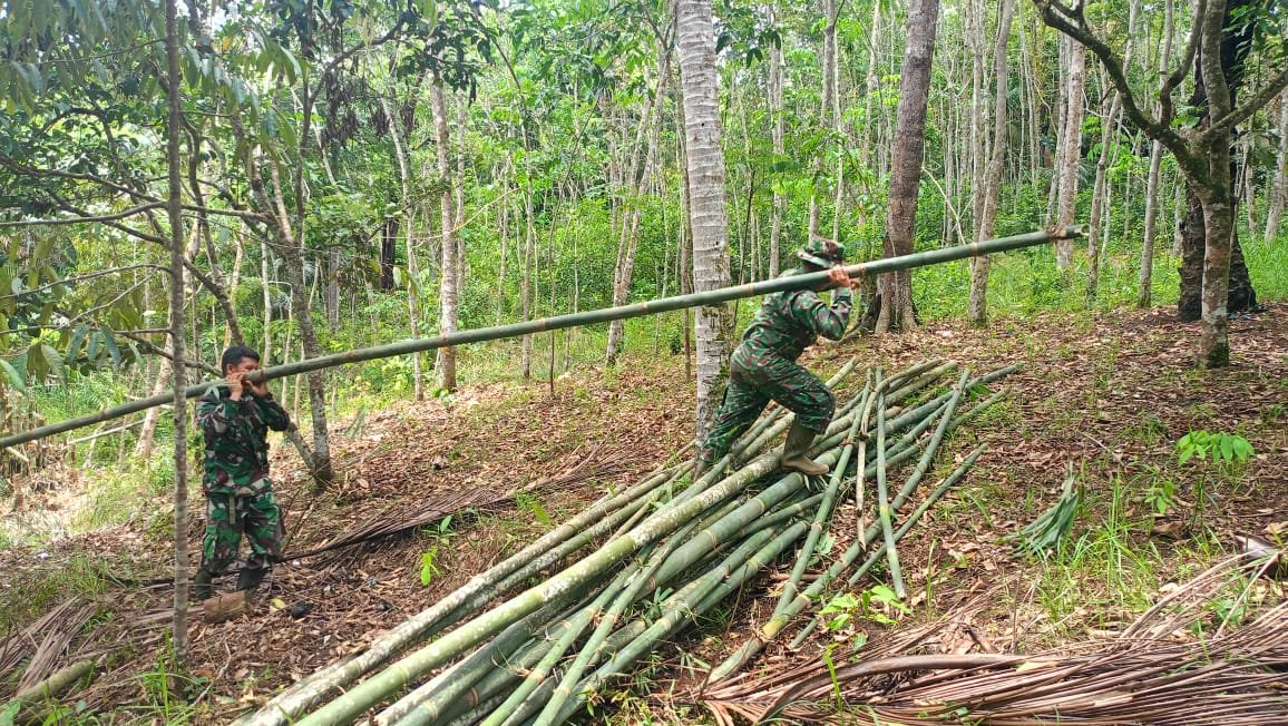 Seperti dilakukan Satgas Serda Hendra Wandi bersama anggota Satgas TMMD lainnya sedang mencari bambu guna menahan tanah hasil galian dan dijadikan kolam ikan berukuran 8 meter x 10 meter.