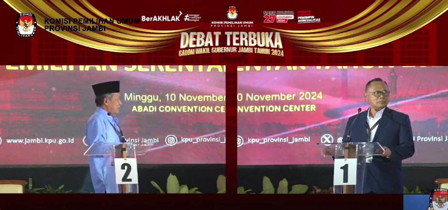 JurnalOne.com, JAMBI – Debat terbuka calon Wakil Gubernur Jambi berlangsung sengit beradu argumen dan gagasan yang diselenggarakan Komisi Pemilihan Umum (KPU) provinsi Jambi di Abadi Convent Center (ACC), Minggu (10/11/2024) malam.