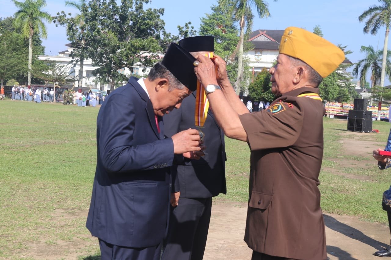 JurnalOne.com, JAMBI – Wakil Gubernur Abdullah Sani, dan Sekretaris Daerah Provinsi Jambi Sudirman, menerima penghargaan Bintang Legiun Veteran Republik Indonesia dari Dewan Pengurus Pusat Legiun Veteran Republik Indonesia (DPP LVRI) yang diserahkan langsung oleh Ketua DPD LVRI Provinsi Jambi Mayor. Inf. (Purn) Mulia Sihombing usai melaksanakan Upacara Peringatan Hari Lahir Pancasila Tahun 2025 yang dilaksanakan di Lapangan Kantor Gubernur Jambi, Senin (02/06/2025) pagi.