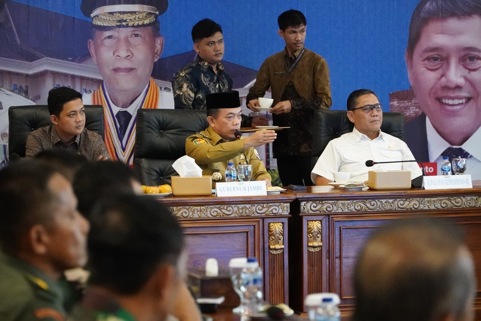 “Salah satu yang saya bilang bahwa di Jambi ini dari dulu saya melihat potensi yang luar biasa, namun hasil itu akan lebih luar biasa apabila ditata dengan baik dan biasa dari dulu sampai sekarang kenakalan-kenakalan oknum itu ada, tapi saya bertugas di sini untuk bersama-sama dengan tim saya membantu dan menjaga bagaimana perkembangan potensi yang ada di Jambi. Jika ada kesempatan bagaimana caranya kita komunikasi langsung dengan pihak-pihak terkait dan kementerian terkait dan juga daerah yang memang berkepentingan. Di situ intinya adalah jangan mempersulit wilayah yang sedang membangun dengan aturan-aturan regulasi dan kami sudah mendengar bagaimana kesiapan tentang Karhutla dan tata kelola energi yang sudah dijelaskan,” jelas Kepala Staf Kepresidenan RI.