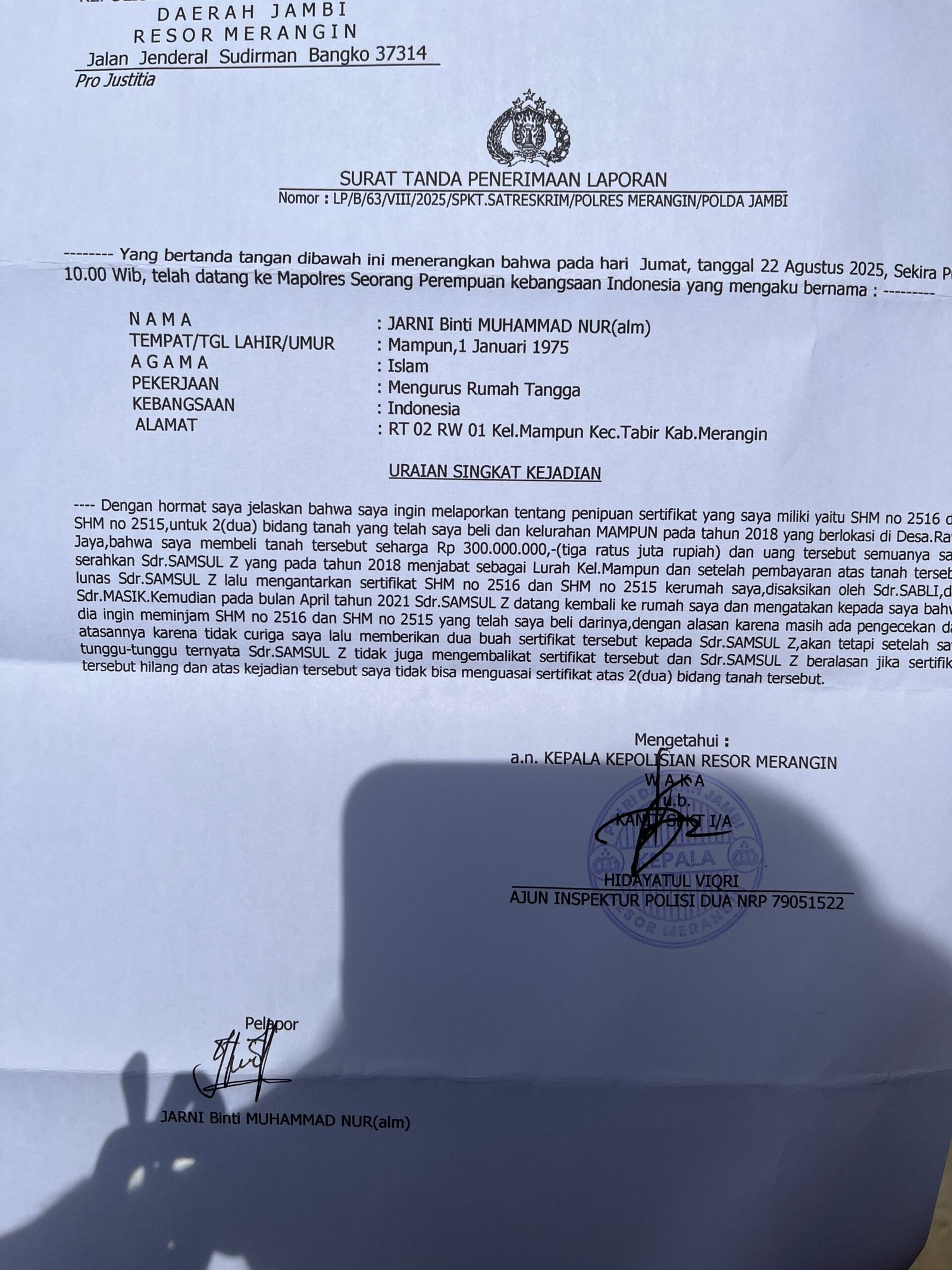 Hal ini dibuktikan dengan nomor laporan LP/B/63/VIII/2025/SPKT.SATRESKRIM/Polres Merangin/Polda Jambi hari Jum’at (22/08/2025) kemaren.