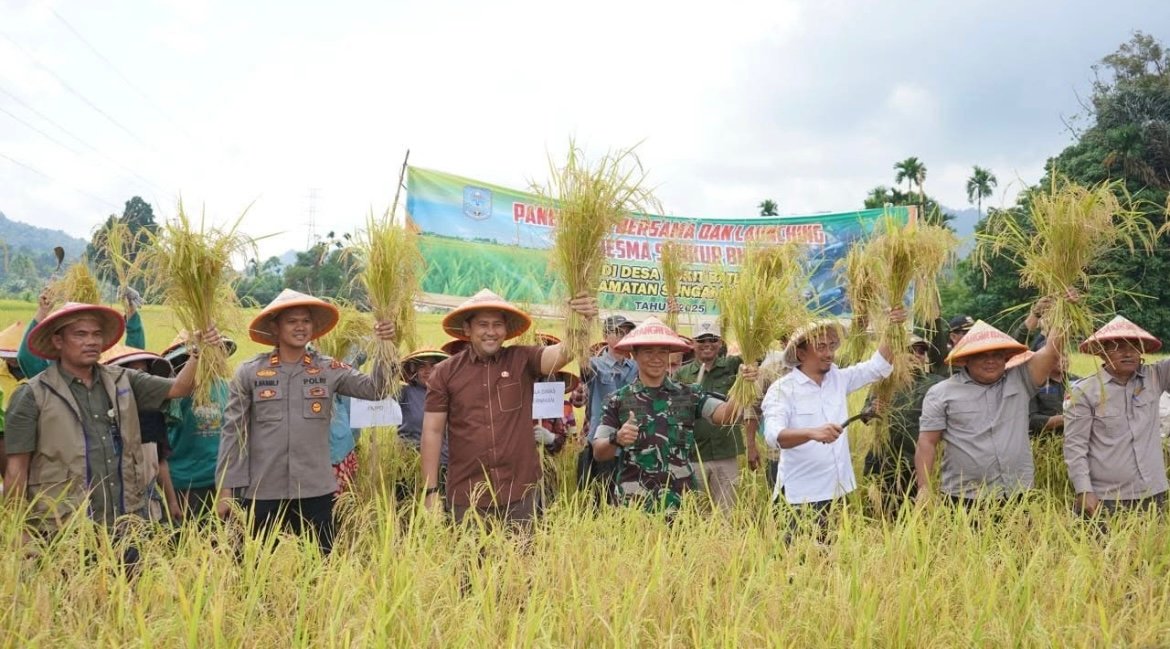 JurnalOne.com, BANGKO -Bupati Merangin M Syukur bersama Dandim 0420/Sarko Letkol Inf Yakhya Wisnu Arianto dan Pj Sekda Zulhifni serta ratusan warga, panen raya padi sawah di kampung halaman Desa Bukit Batu Kecamatan Sungai Manau, Minggu (21/09/2025).