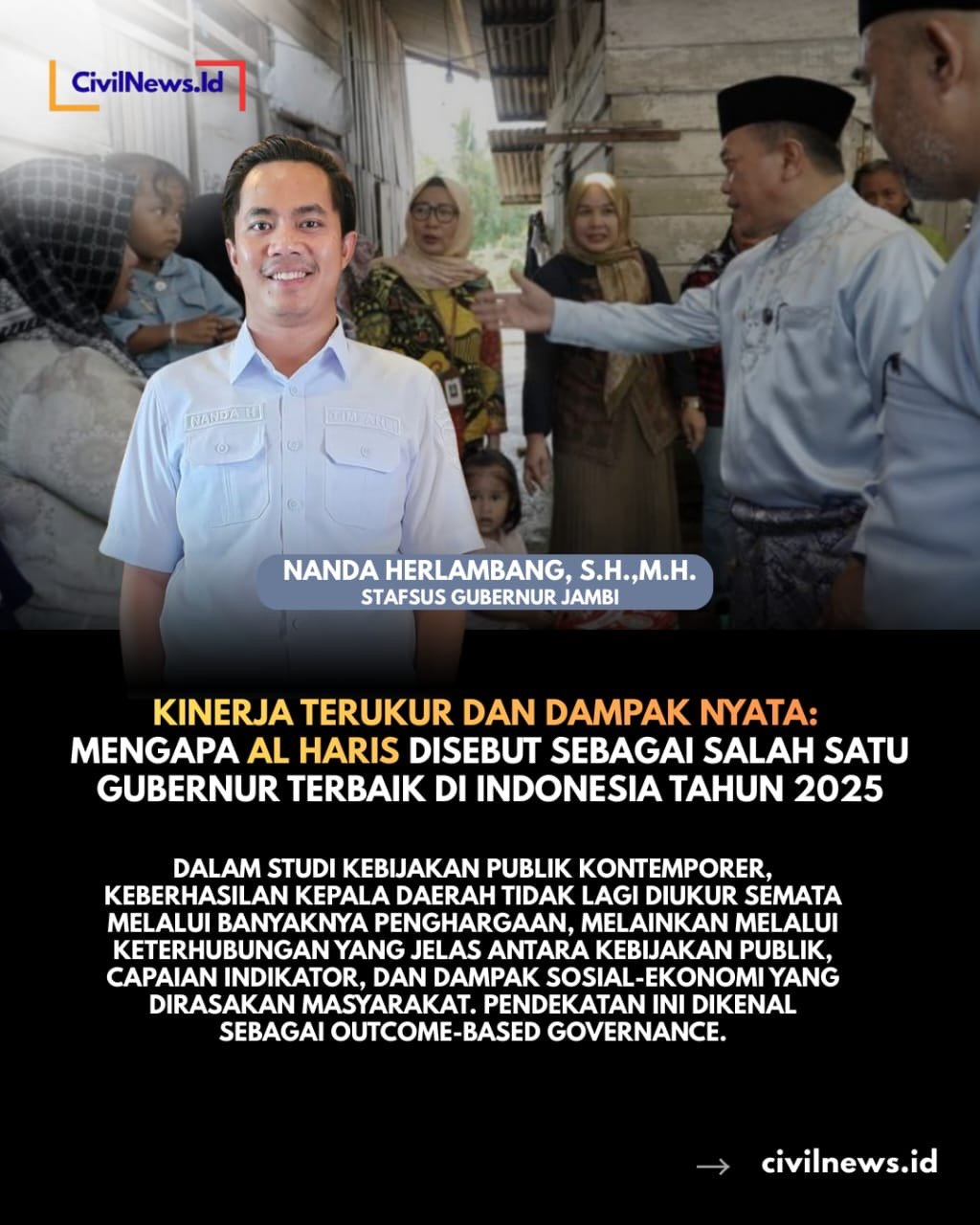Jika diukur melalui pendekatan outcome-based governance, kinerja Gubernur Al Haris sepanjang 2025 menunjukkan konsistensi hubungan antara: